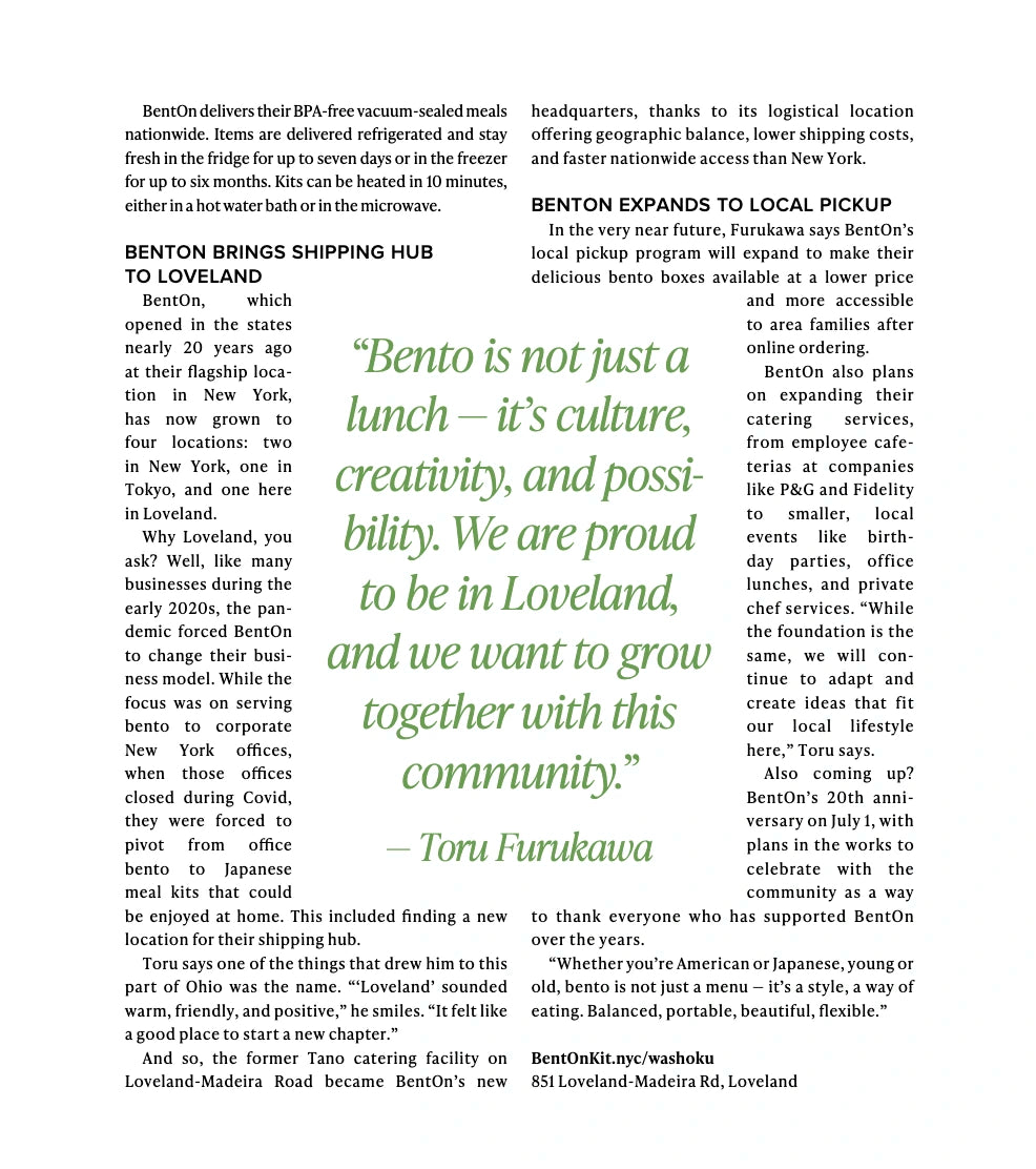 BentOn was founded in 2006 by Toru Furukawa in New York City. What started as a small kitchen grew into a production operation serving companies, events, and customers across the country. Today, our main factory is here in Loveland, Ohio, where we cook and ship Japanese meals nationwide. This pop-up is our way of saying thank you to our local community.