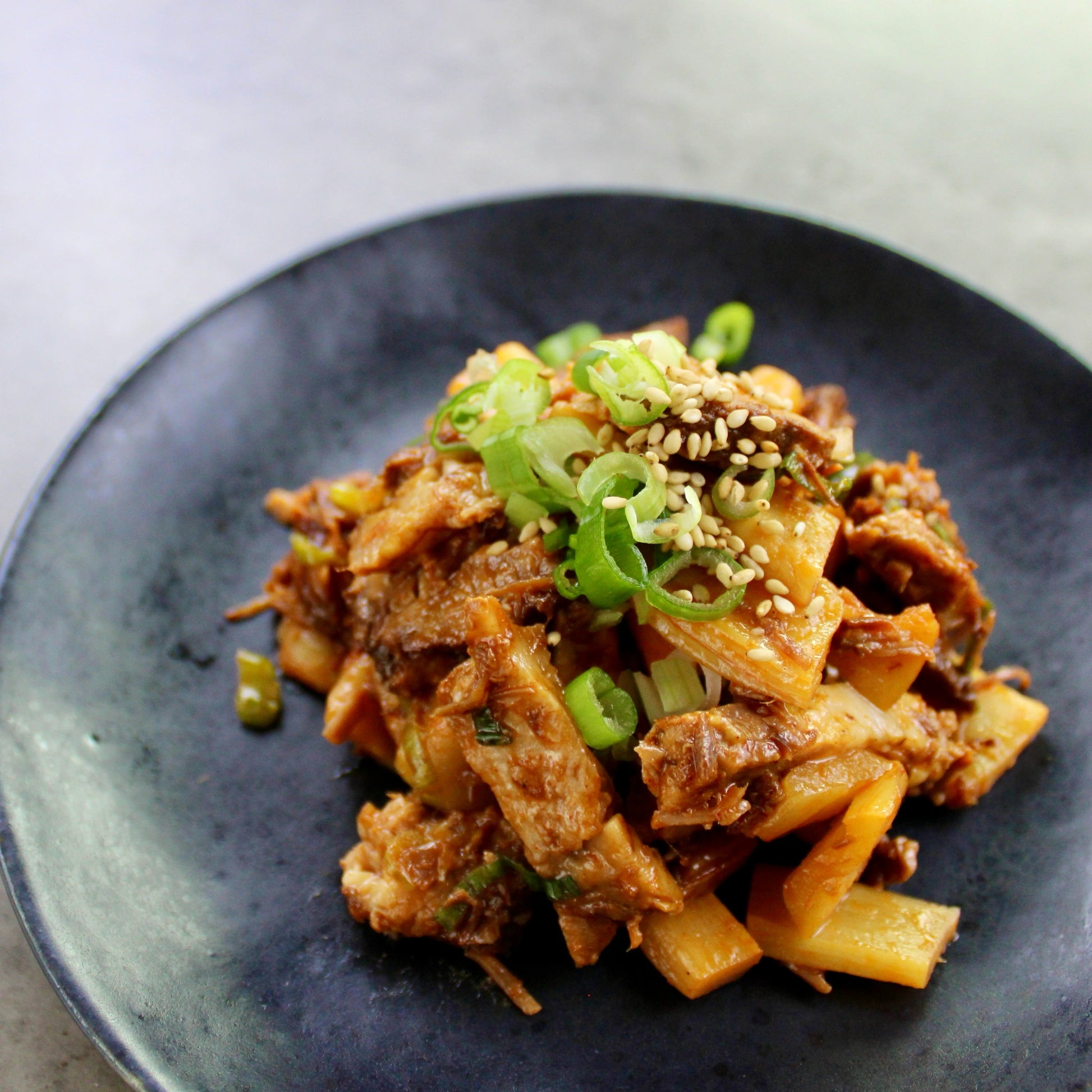 Tender braised pork and flavorful bamboo shoots seasoned with a spicy kick. This savory appetizer pairs perfectly with drinks, delivering a delicious balance of rich umami and zesty heat.