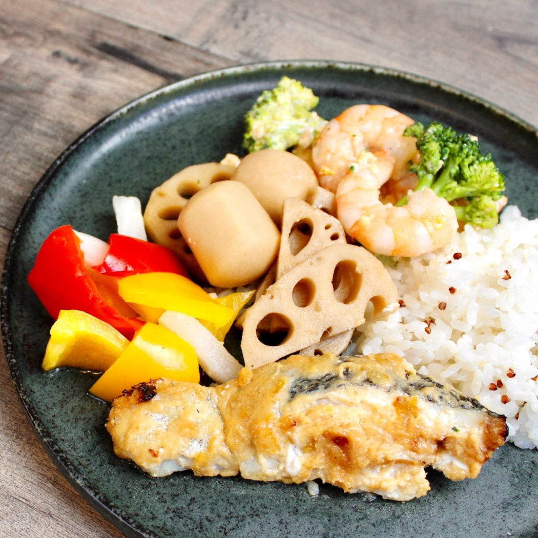 Yuzu-miso glazed salmon with the refreshing aroma of yuzu, served with simmered root vegetables, colorful pickled veggies, and a stir-fry of broccoli, egg, and shrimp. Packed with protein, full of nutrients, and wonderfully satisfying – a highly recommended dish!